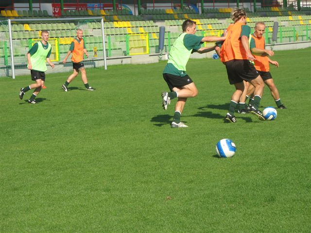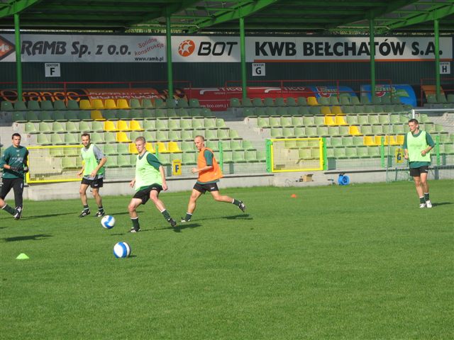Dzisiaj przed południem odbył się trening na głównej płycie boiska. Piłkarze, którzy znaleźli się w wyjściowej jedenastce na mecz z Lechem, mieli lekki rozruch. Pozostała część kadry ćwiczyła pod okiem trenerów. W zajęciach nie wzięli udziału Tomasz Jarzębowski i Marcin Kowalczyk, którzy przechodzą specjalistyczne badania. Natomiast z mniejszym obciążeniem trenowali Edward Cecot i Marcin Komorowski. Na jutro przewidziano dwie sesje treningowe