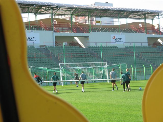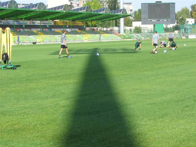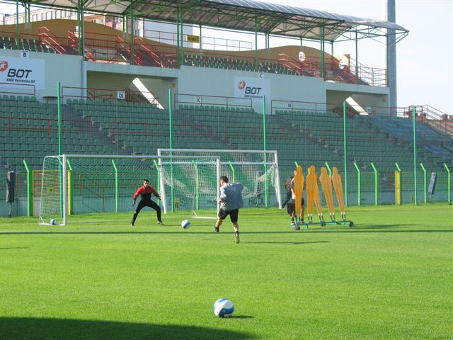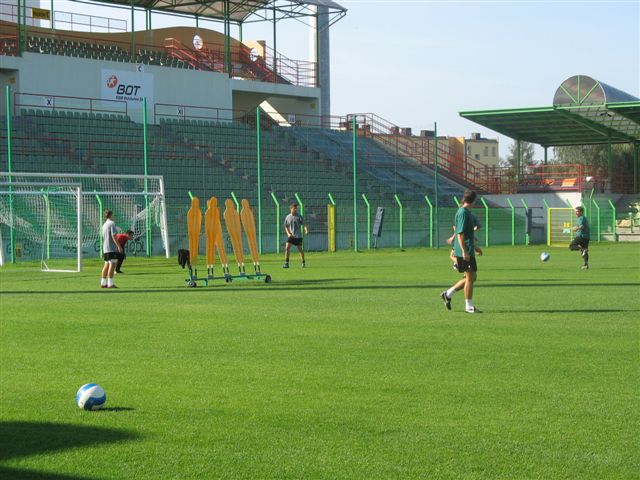 Trening odbywa się przy dźwiękach maszyn, ponieważ cały czas trwają prace przy obniżaniu ogrodzenia do wysokości umożliwiającej jeszcze lepszą obserwację spotkań piłkarskich. Te zabiegi oraz renowacja trybuny honorowej potrwają do przyszłotygodniowego meczu z ŁKS Łódź. Klub poprawi również oznaczenie miejsc przeznaczonych dla posiadaczy karnetów.
